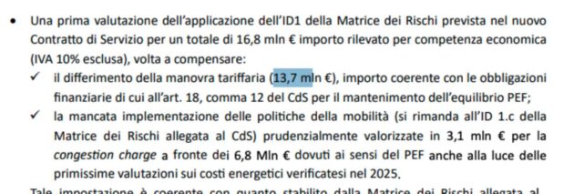 Per compensare tali mancati introiti, Atac invoca la “Matrice dei Rischi” del Contratto di Servizio e chiede a Roma di riconoscere, in ogni caso, 16,8 milioni di euro complessivi. Difatti, oltre ai 13,7 milioni suddetti, per mancati introiti del biglietto, ci sono altri 3,1 milioni dovuti all’assenza di politiche di mobilità promesse (dall’assessore Patanè), ma mai realizzate, secondo Atac, come la congestion charge. In pratica, Roma deve risarcire Atac per ciò che non ha deciso o fatto o fatto solo parzialmente.