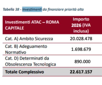 Terzo fronte, gli investimenti. Nella sezione 2026 del Piano, Atac elenca 72,3 milioni di interventi coperti da Roma, ma accanto scrive che mancano altri 22,62 milioni “da finanziare – priorità alta” per l’anno in corso.