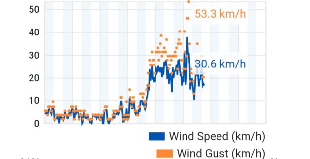 Grafico dal sito wunderground relativamente alla stazione meteo del Nuovo Salario nel momento massimo della raffica di vento.