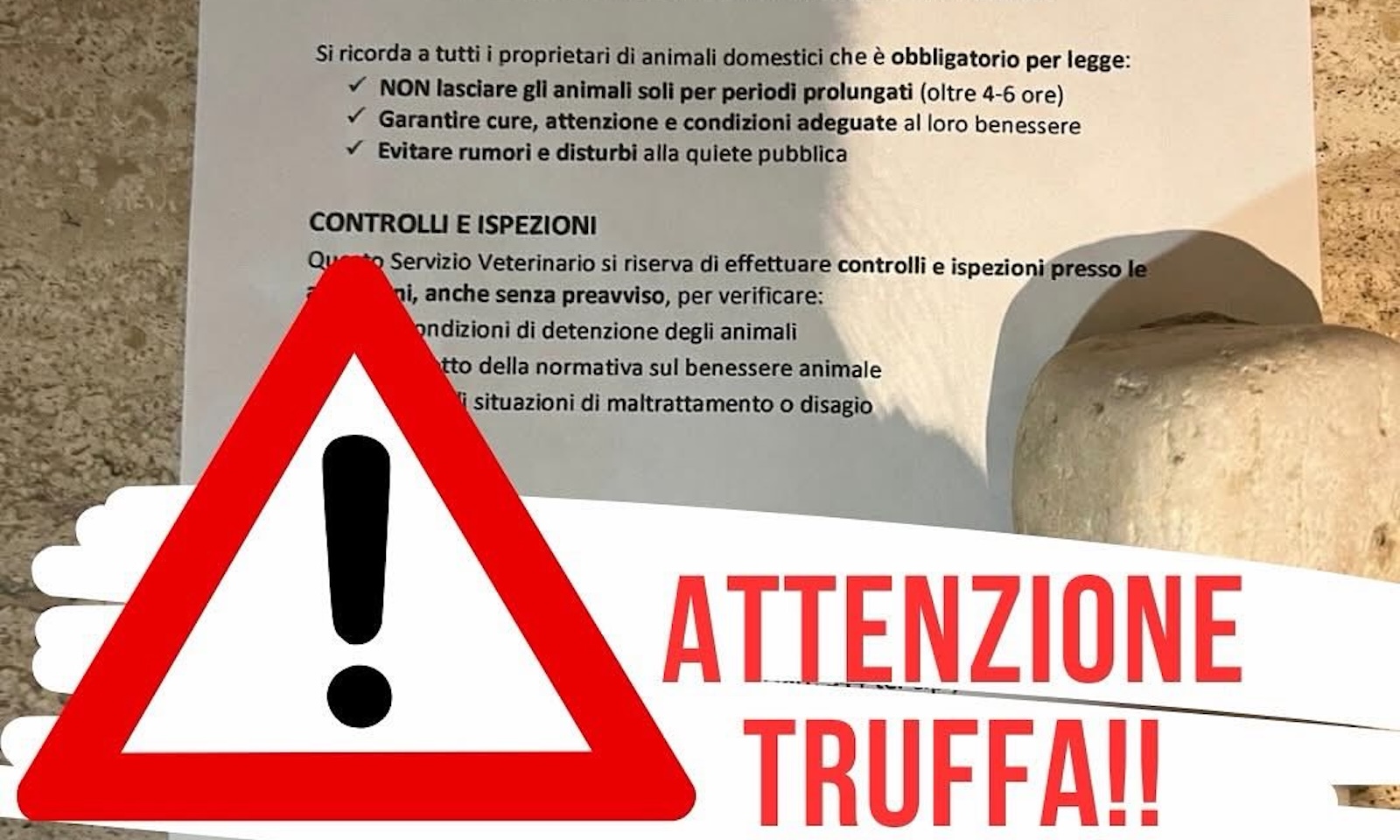 L’avviso, messo nelle bacheche e nei portoni di moltissimi condomini, recita così. “Avviso ai residenti. Animali domestici: obblighi e responsabilità. Si ricorda a tutti i proprietari di animali domestici che è obbligatorio per legge: NON lasciare gli animali soli per periodi prolungati (oltre 4-6 ore). Garantire cure, attenzione e condizioni adeguate al loro benessere. Evitare rumori e disturbi alla quiete pubblica. CONTROLLI E ISPEZIONI. Questo Servizio Veterinario si riserva di effettuare controlli e ispezioni presso le abitazioni, anche senza preavviso, per verificare: condizioni di detenzione degli animali; verificare il rispetto della normativa sul benessere animale; verificare situazioni di maltrattamento o disagio”.