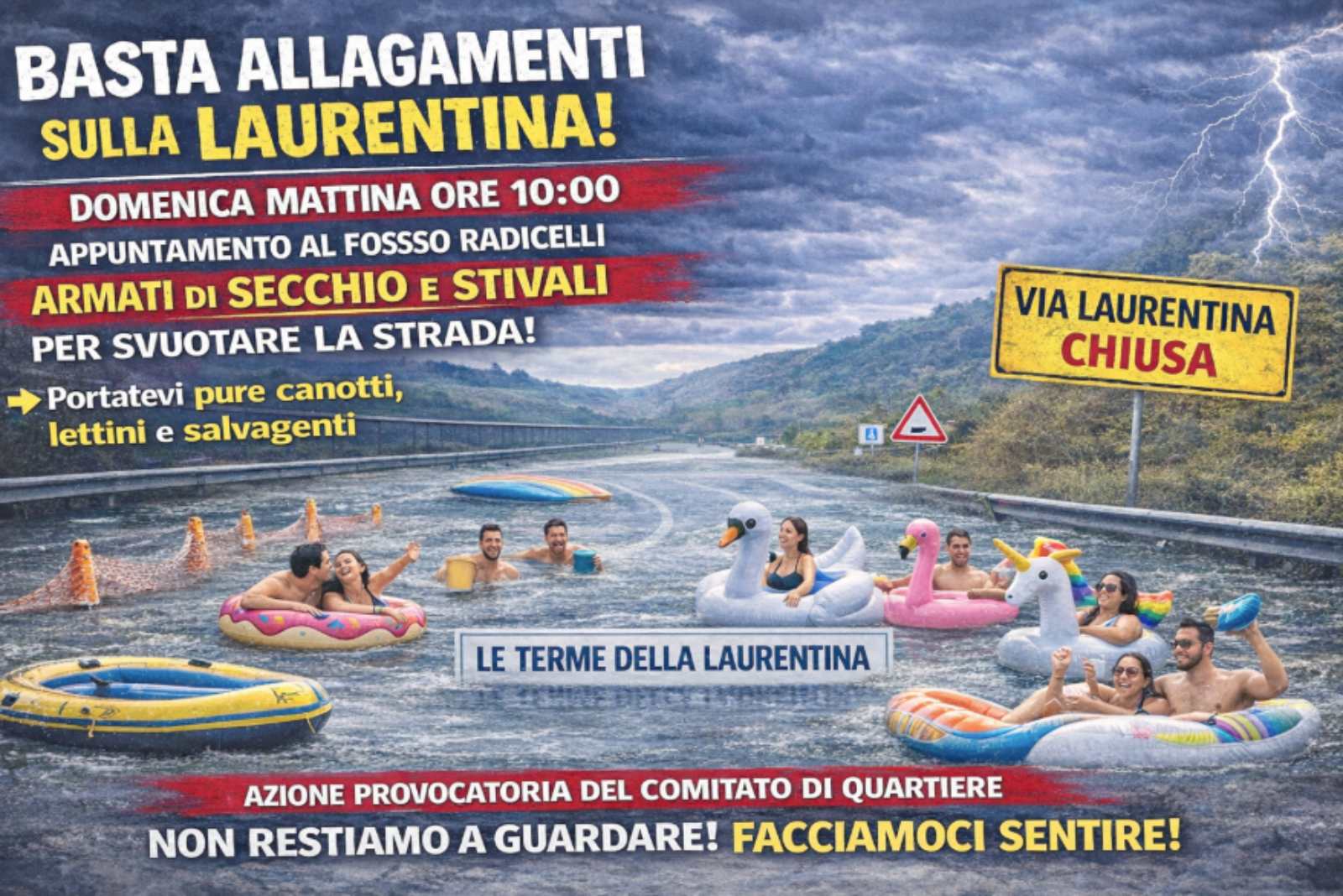 Ed è qui che scatta la protesta, promossa dal Comitato di quartiere delle Cinque Colline Laurentina: domenica 1 febbraio, ore 10, appuntamento “Radicelli”, con secchi e stivali, per ripristinare la viabilità. “Non per giocare ai volontari della Protezione civile – sostengono i promotori – ma per fare quello che le istituzioni non fanno. Aalmeno costringere qualcuno a guardare. A intervenire, come imposto loro dalla legge. La locandina la butta in satira nera: “Le Terme della Laurentina”, con tanto di canotti, lettini e salvagenti. Il comunicato è ancora più secco: “Non vogliamo svuotare una strada con i secchi. Vogliamo svuotare il silenzio della politica e delle istituzioni capitoline”. Qualche settimana fa, il Comitato aveva provato a chiedere spiegazioni al Campidoglio, ma nessuno si era degnato nemmeno di rispondergli.