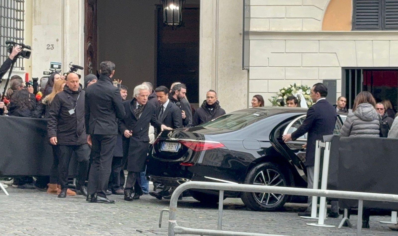 All’arrivo della salma c’erano figure chiave della sua vita: Giancarlo Giammetti, socio e compagno storico, e i “figliocci” dello stilista, Sean e Anthony Sax, che gli sono stati vicini fino all’ultimo.