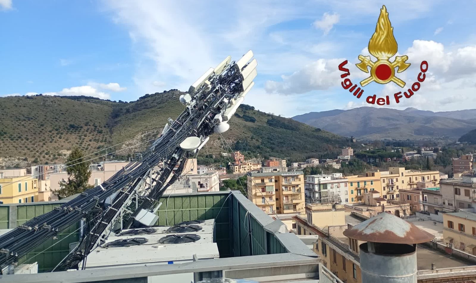 L’intervento è partito intorno alle 11:20 in viale Trieste a Tivoli, all’altezza del civico 79. L’antenna, installata sul tetto di un edificio di quattro piani, ha subito un cedimento strutturale, probabilmente aggravato dal forte vento dei giorni scorsi. La struttura metallica, composta da apparati analogici e digitali, si è parzialmente staccata, rimanendo in bilico sopra la palazzina. Una situazione critica, con il rischio concreto che potesse crollare sulla strada.