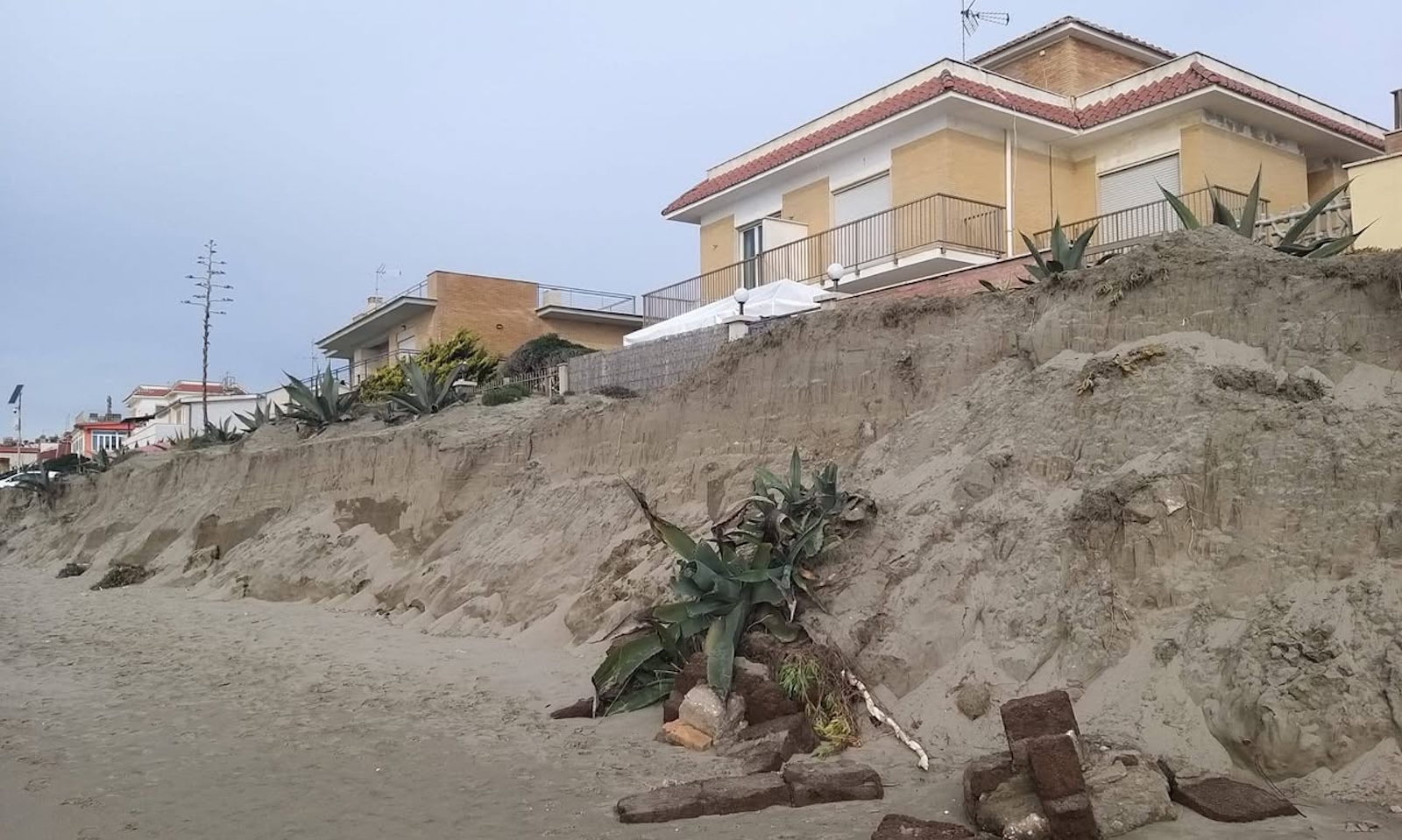 In via Lipsia, a Torvaianica, il litorale ha cambiato volto nel giro di poche mareggiate. Il mare degli ultimi giorni ha portato via una quantità impressionante di sabbia, lasciando scoperta una scarpata alta e instabile. Le dune, ormai senza protezione, si sono sbriciolate. Alla base delle palizzate restano detriti e materiali trascinati dall’acqua. La distanza tra la stradina costiera e la battigia si è ridotta a vista d’occhio. Se l’erosione dovesse continuare con questa intensità, il rischio è che le abitazioni più vicine alla costa potrebbero finire esposte direttamente all’azione del mare.