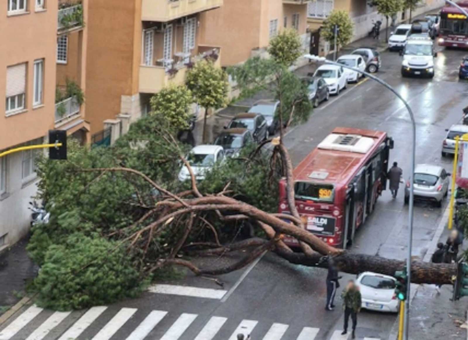Roma, alla Balduina un pino è crollato all’incrocio tra via Ugo de Carolis e via Damiano Chiesa, precipitando da un’area privata. Ha distrutto un’auto in sosta e ha colpito la parte posteriore di un autobus Atac della linea 990, mandando in frantumi il vetro posteriore. Strada chiusa, area delimitata, traffico deviato: nessun ferito tra passeggeri e residenti, ma la scena è già un manifesto politico di Roma nel 2026.